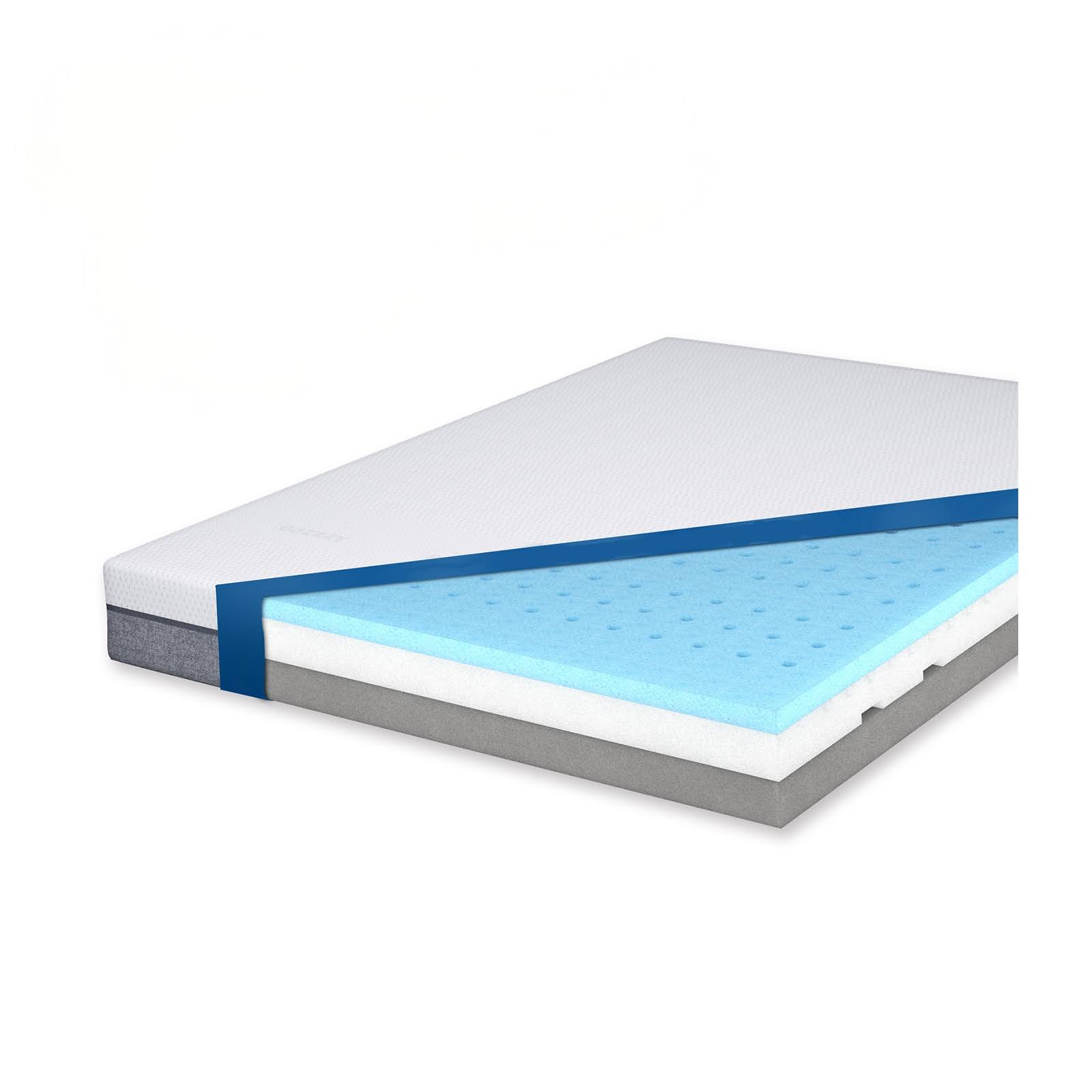 Die eazzzy Matratze ist das Mass aller Dinge im Bereich Schlafqualität: Gleich drei perfekt aufeinander abgestimmte Schaumschichten sorgen für ein unvergleichliches Schlafgefühl. Mit einer 4 cm Schicht Gel-Infused-Memory-Schaum, welcher sich Ihrem Körper perfekt anpasst, einer 8 cm Schicht Zonenschaum, der die Druckpunkte Ihres Körpers optimal entlastet und so für eine gerade Ausrichtung der Wirbelsäule sorgt und einer 8 cm Schicht Stützschaum, welcher Ihren Körper von unten stützt und dafür sorgt, dass die Matratze nur da einsinkt, wo sie soll. Insgesamt hat die eazzzy Matratze eine Höhe von 20 cm und ist damit im Vergleich um 10 % höher als andere Matratzen - für ein leichteres Ein-/Aussteigen und Boxspring-Feeling.